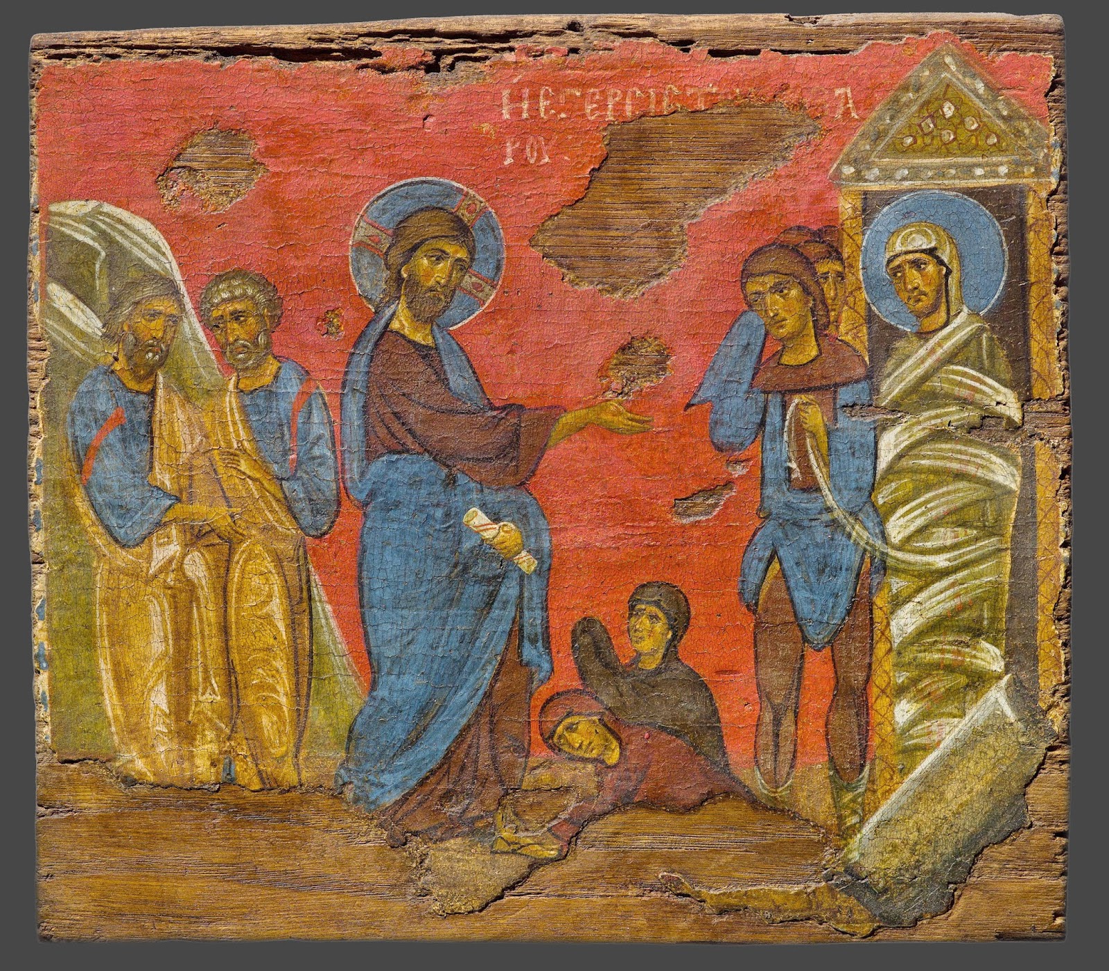 Ícone com a Ressurreição de Lázaro, século XII, têmpera a ovo sobre madeira; dimensões totais: 21,5 × 24 cm (8 7/16 × 9 7/16 pol.); Museu Bizantino e Cristão, Atenas.